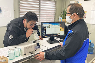 運行管理スタッフとドライバーが1対1で向かい合い、アルコールチェック、健康状態の確認、その日の天候による注意点など、安全運行をバックアップするための大切な行いです。